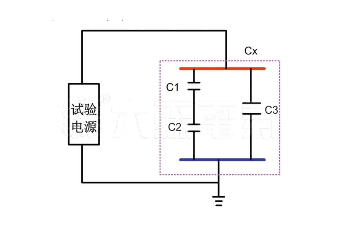 《GB 50150-2006 電氣裝置安裝工程電氣設備交接試驗標準》要求新竣工的電纜需要進行耐壓試驗,高壓電纜交流耐壓等效電路如下圖,用C1、C2、C3組合模擬被試電纜的各個絕緣部件,在試驗過程中C1、C2、C3同時承受高電壓的考驗。